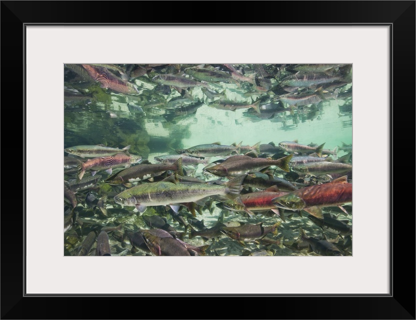 <p>USA, Alaska, Katmai National Park. Underwater view of spawning Chum and Red Salmon in stream near Kuliak Bay in late summer.</p>