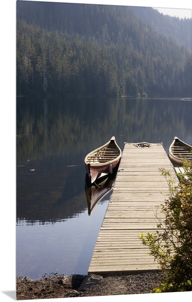 <p>USA, Alaska, Ketchikan, Harriet Hunt Lake. Canoes tied up at dock for tours.</p>
