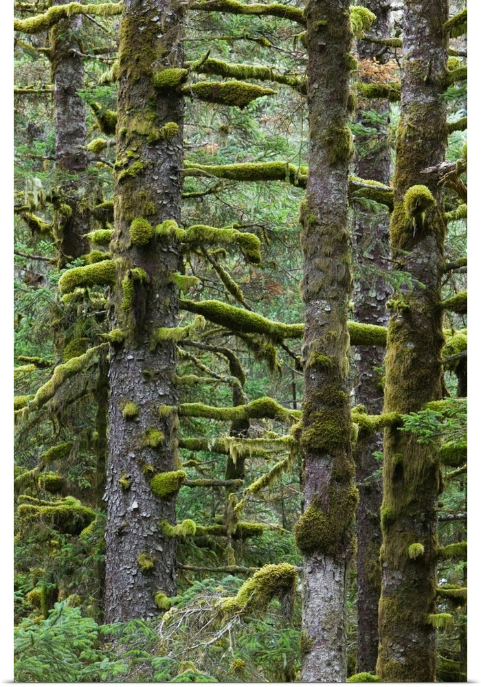 <p>Alaska, Southwest Kodiak Island. Kodiak, Pacific Fir Trees and Moss, Fort Abercrombie State Historical Park.</p>