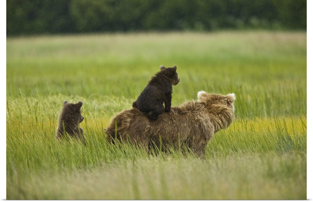<p>USA, Alaska, Lake Clark National Park. A mother grizzly and her cubs scout for pending danger in the meadow.</p>