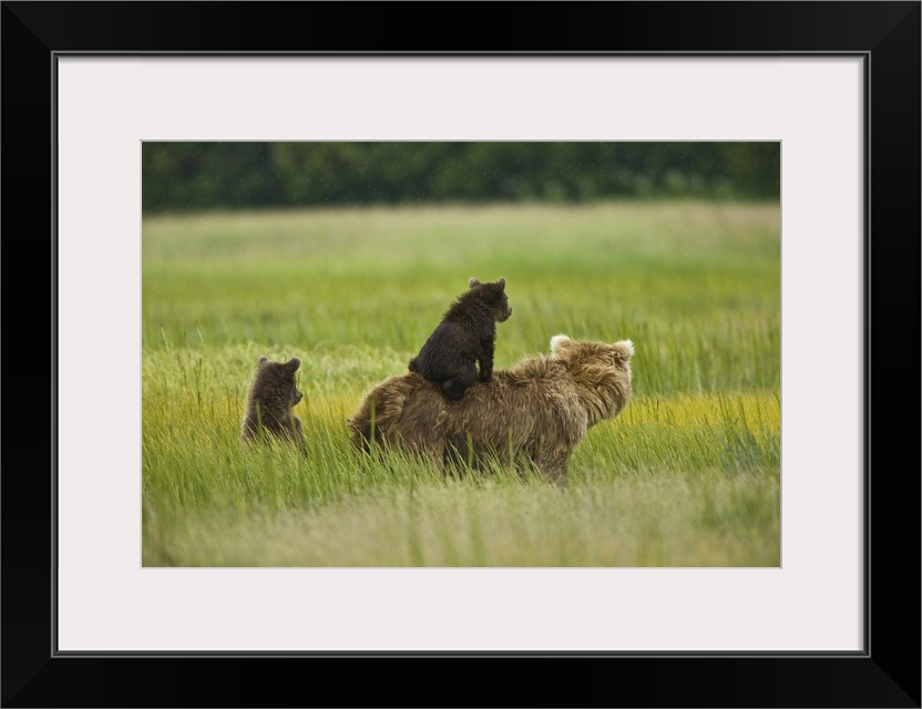 <p>USA, Alaska, Lake Clark National Park. A mother grizzly and her cubs scout for pending danger in the meadow.</p>