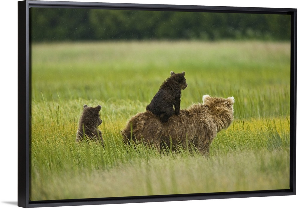 <p>USA, Alaska, Lake Clark National Park. A mother grizzly and her cubs scout for pending danger in the meadow.</p>