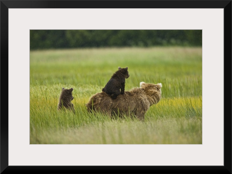 <p>USA, Alaska, Lake Clark National Park. A mother grizzly and her cubs scout for pending danger in the meadow.</p>