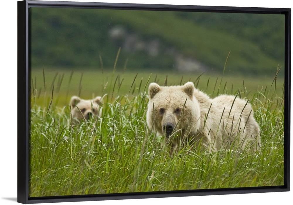 <p>USA, Alaska, Lake Clark National Park. Blonde grizzly bear sow and partially hidden cub.</p>
