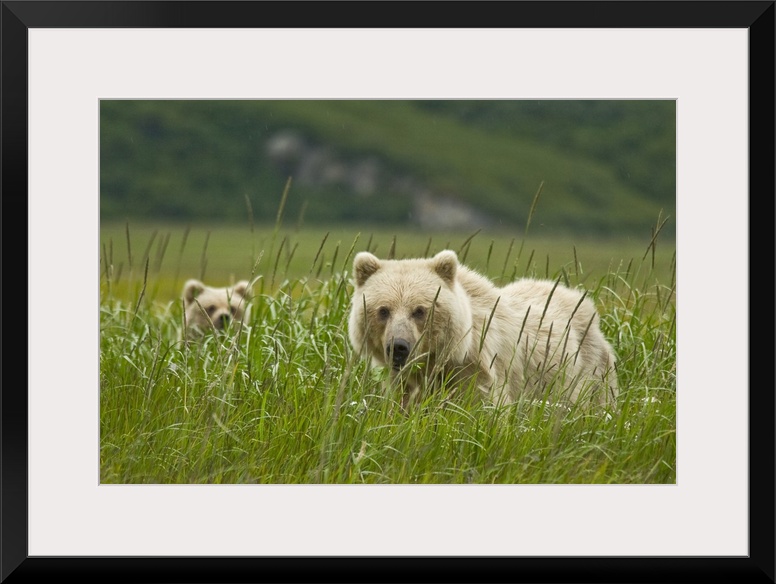 <p>USA, Alaska, Lake Clark National Park. Blonde grizzly bear sow and partially hidden cub.</p>