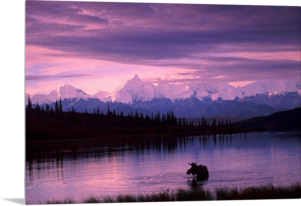 <p>Canvas photo art of a moose standing in a lake with evergreen trees silhouetted in the background against bright snowy capped mountains and a purple sky.</p>