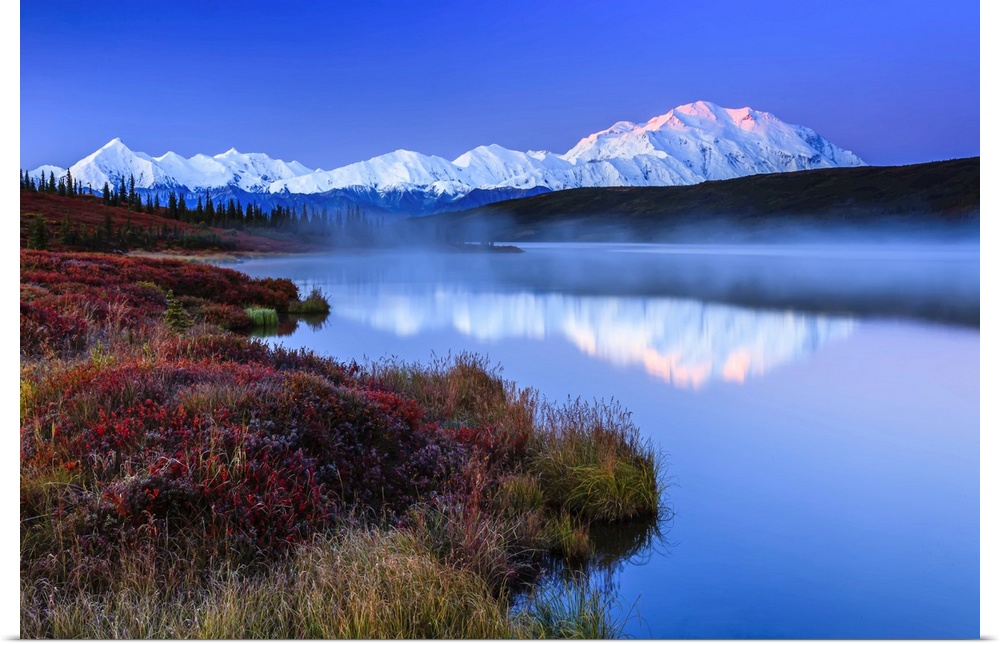 <p>Reflection of the Alaska Range mountains in the tranquil water of Wonder Lake at sunrise in Denali National Park and Preserve Alaska, United States of America</p>