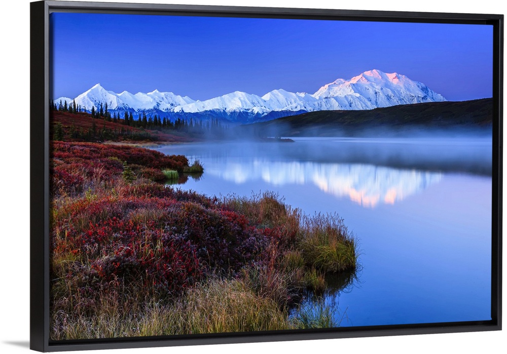 <p>Reflection of the Alaska Range mountains in the tranquil water of Wonder Lake at sunrise in Denali National Park and Preserve Alaska, United States of America</p>