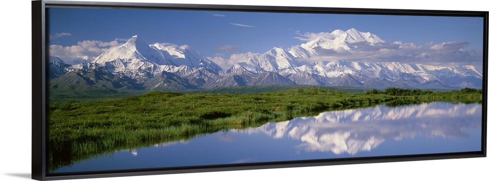<p>A snow covered mountain range is photographed in panoramic view with a large field shown just in front and a body of water that reflects the mountains.</p>