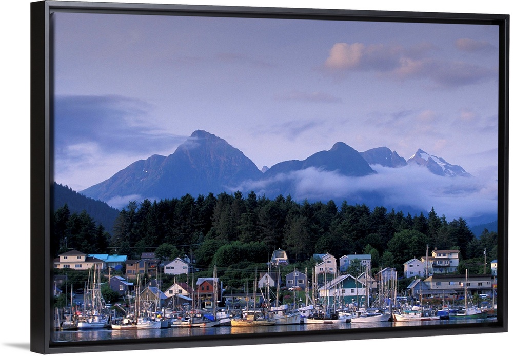 <p>USA, Alaska, Sitka, part of the Sitka fishing fleet tied up, mountains of Baranof Island behind.</p>