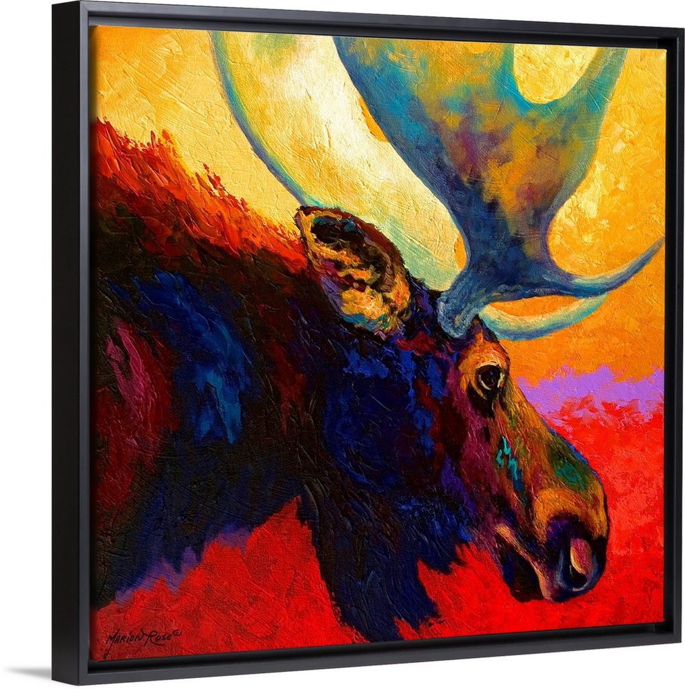 <p>Square, contemporary painting of the profile of a moose with large antlers, from the shoulders forward. Painted on a brightly colored background using short, rough brushstrokes.</p>