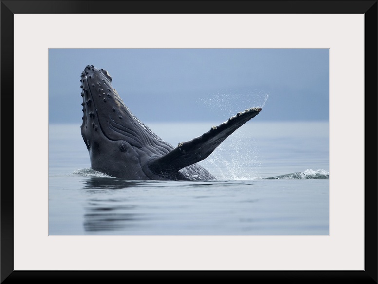 <p>USA, Alaska, Tongass National Forest, Young Humpback Whale (Megaptera novaengliae) makes eye contact while splashing on its back in Icy Strait on summer evening.</p>