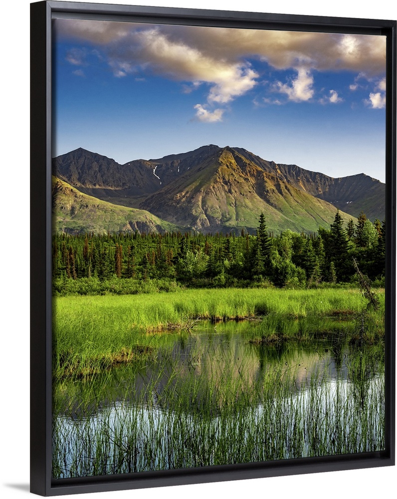 <p>From back to front, under a glowing sunset cloud cover, a beautiful Alaskan mountain range is fronted by rich forest behind verdant green marsh grasses all reflected in still water with a foreground of vibrant green rushes.</p>