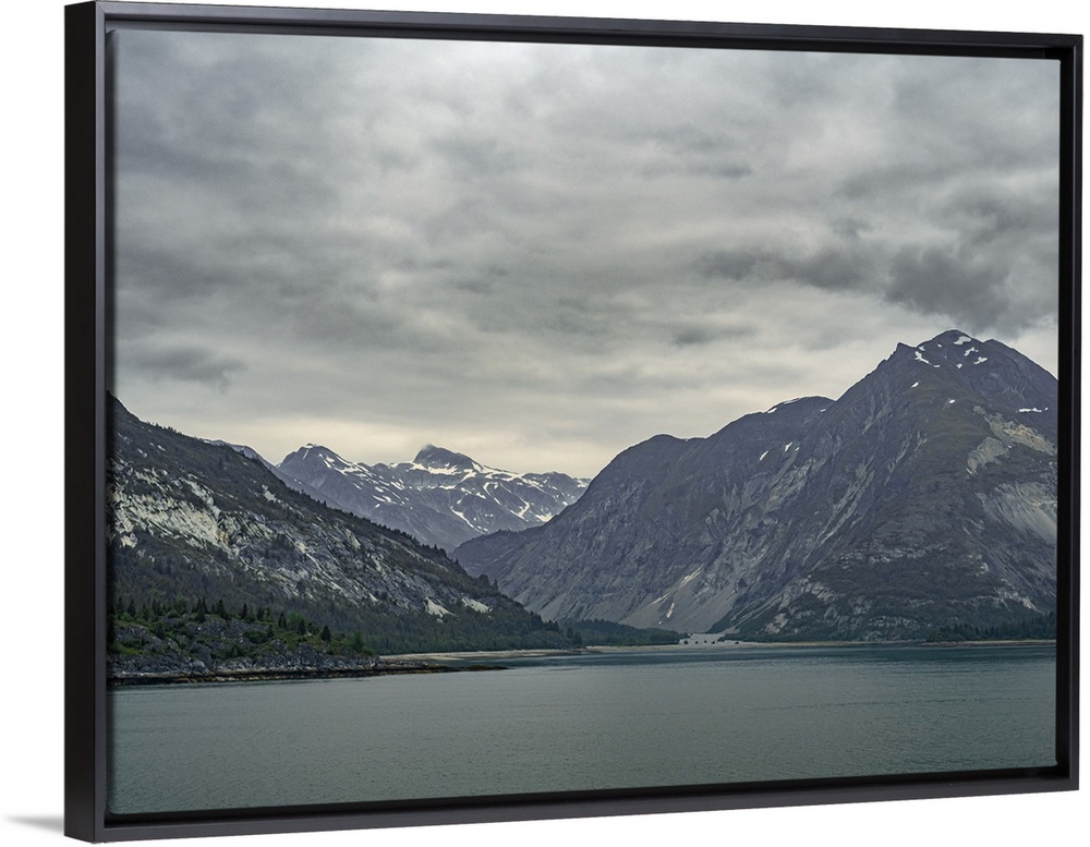 <p>Soft unsaturated colors grace this serene and beautiful scene of Alaskan mountains rising above aquamarine glacial waters under rich cloud cover invoking a peaceful serene atmosphere.</p>