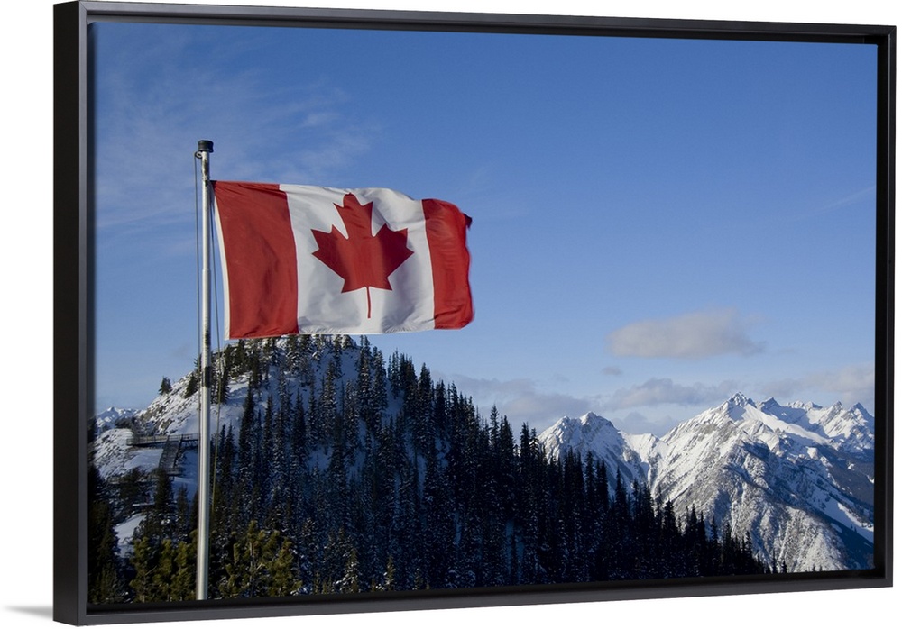 <p>Canada, Alberta, Banff. Mountain views with Canadian flag on the summit of Sulphur Mountain.</p>
