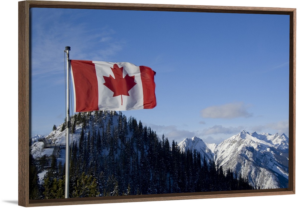<p>Canada, Alberta, Banff. Mountain views with Canadian flag on the summit of Sulphur Mountain.</p>