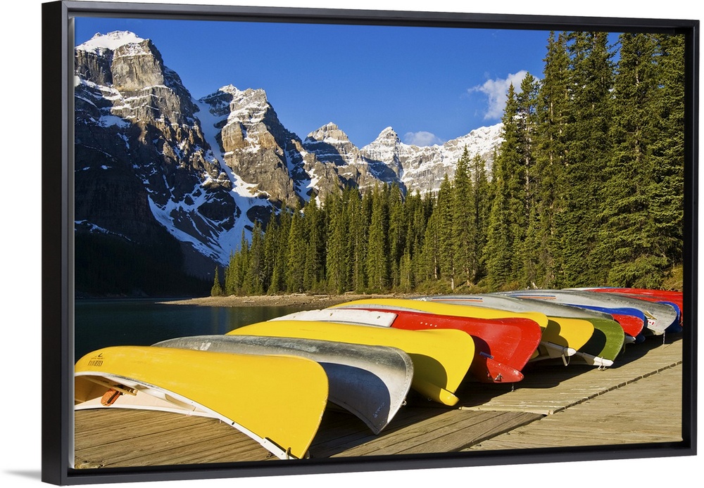 <p>North America, Canada, Alberta, Banff National Park, Moraine Lake and rental canoes stacked on shore</p>