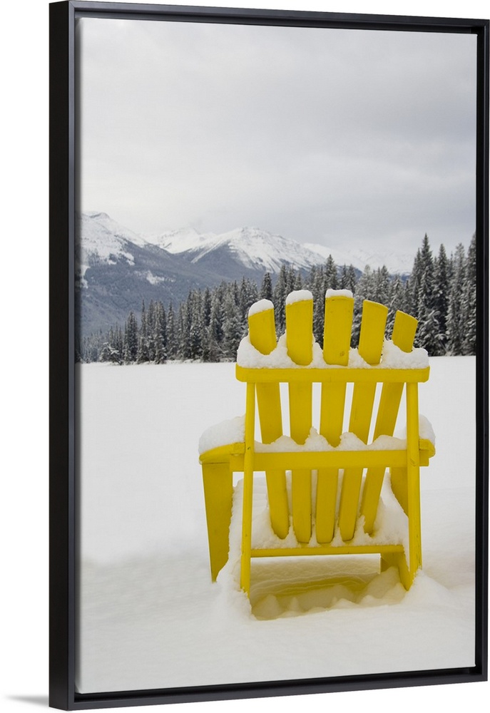 <p>Canada, Alberta, Jasper, Jasper NP. Fairmont Jasper Park Lodge. Colorful chairs around frozen lake, "Lac Beauvert".</p>