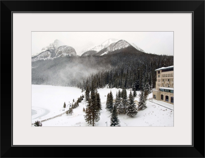 <p>Canada, Alberta, Lake Louise. Farimont Chateau Lake Louise, overview of frozen Lake Louise.</p>