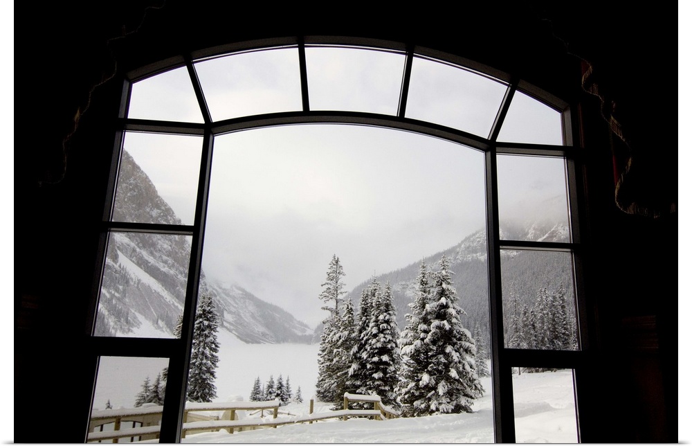 <p>Canada, Alberta, Lake Louise. Farimont Chateau Lake Louise. View over the frozen Lake Louise from the Old dining room.</p>