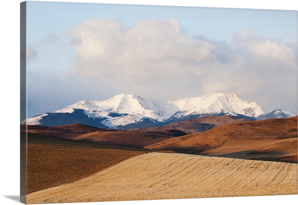 <p>Alberta Landscape With Golden Fields In The Foothills And The Canadian Rockies In The Distance; Alberta, Canada</p>