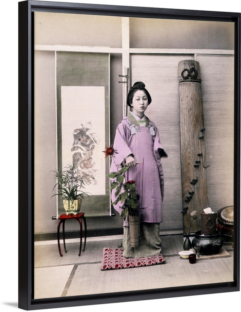 <p>Photographic print : albumen, hand coloured with watercolour. Photograph shows a portrait of a young woman fulllength, standing, facing front, holding a small longhandled bucket with flowers in it. There is a table with potted plant in front of a hanging.</p>