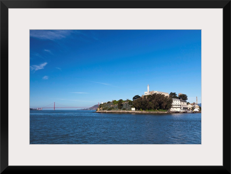 <p>Alcatraz island and rock and Golden Gate bridge on bright and sunny day.</p>