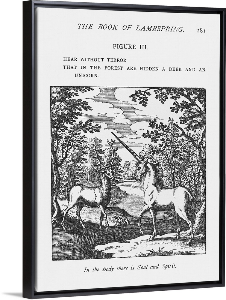 <p>Alchemy. Historical artwork from The Book of Lambspring (1749 edition) of a meeting between a deer and a unicorn in a wood. In alchemy, the deer signified the Sun and the unicorn represented the Moon. Alchemy was the pseudoscientific predecessor of chemistry, which among other ideas is best known for its practitioner's trying to turn base metals into gold.</p>
