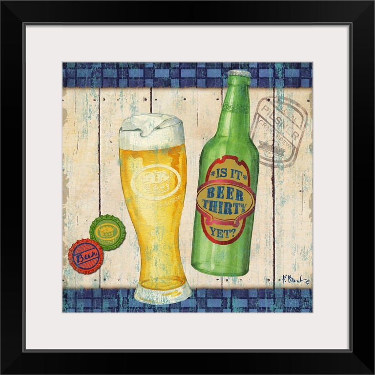 <p>Decorative artwork featuring a pint and a bottle of beer with bottlecaps.</p>