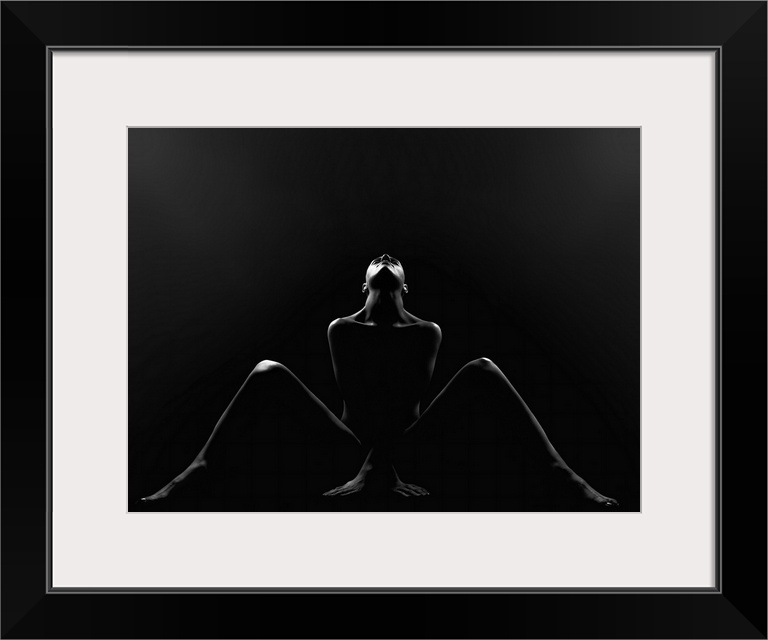 <p>Low key black and white fine art photograph of a silhouette of a woman sitting on the ground, looking up, with her legs spread apart and hands on the ground.</p>