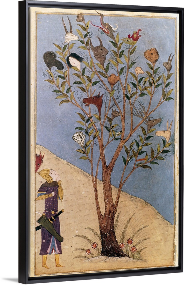 <p>Alexander the Great contemplates the Talking Tree during the end of his travels. Illumination from a Timurid Shanameh, from Shiraz,c1430.</p>