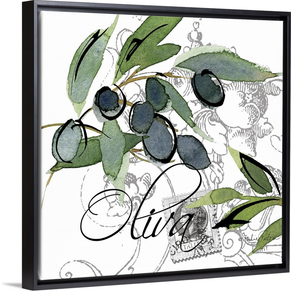 <p>Square Italian kitchen decor with a painting of olive branches on a white and gray designed background and "Oliva" written on top in black.</p>