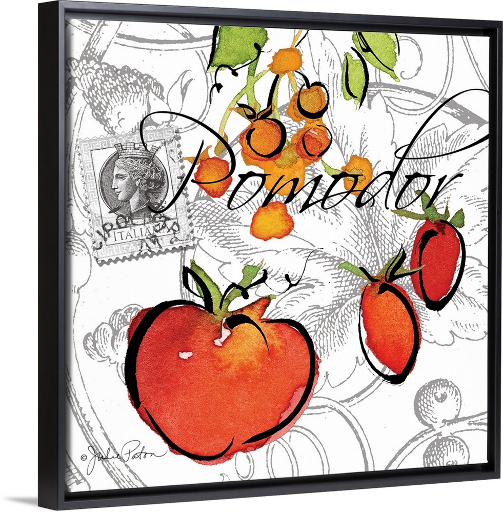 <p>Square Italian kitchen decor with a painting of tomatoes on a white and gray designed background and "Pomodor" written on top in black.</p>