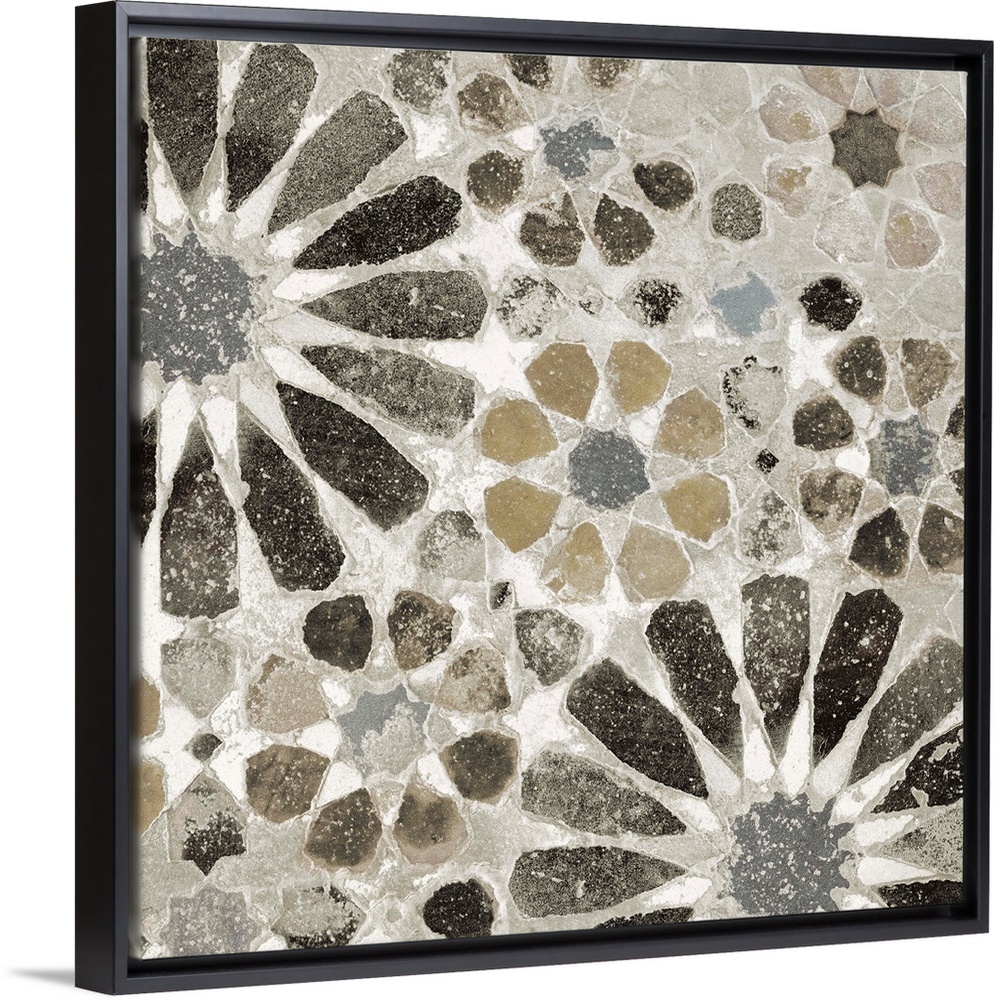 <p>Square image of floral designed tile in shades of black, grey and brown with white speckles overlapping.</p>