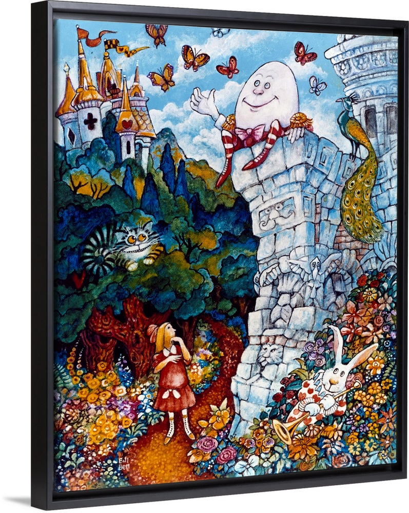 <p>Alice in Wonderland, Cheshire Cat and the White Rabbit look up at Humpty Dumpty sitting on the wall with a peacock.</p>