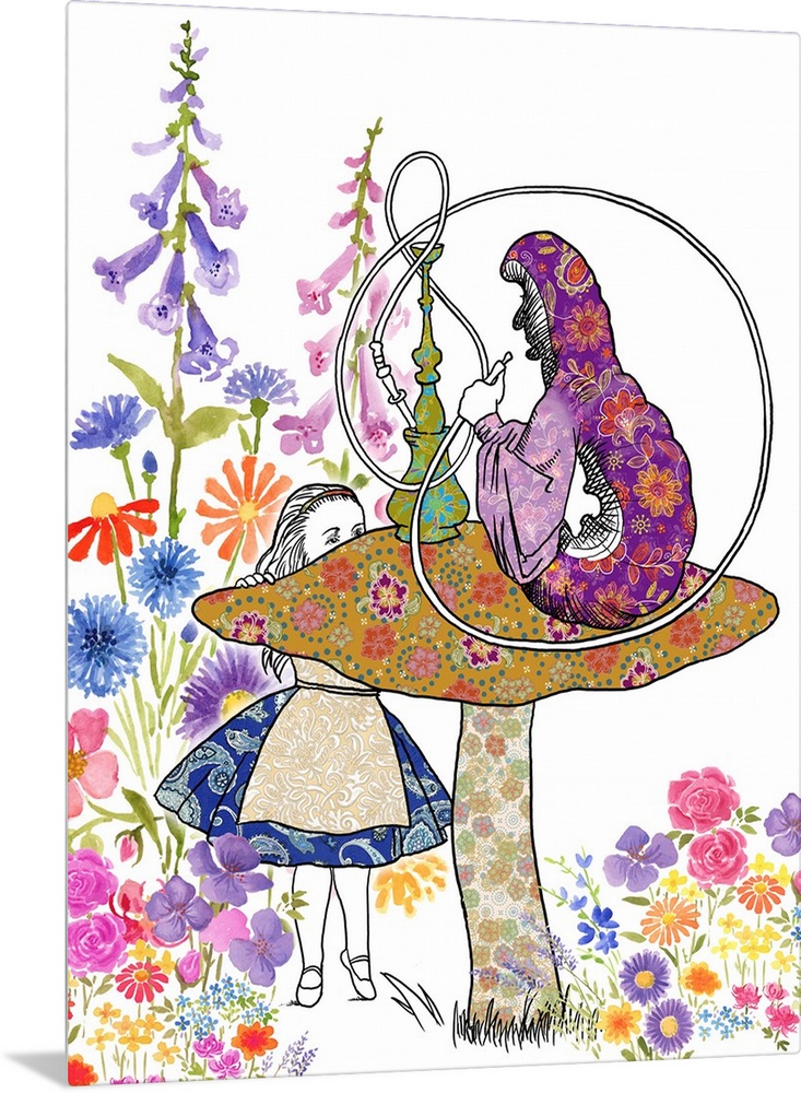 <p>The caterpillar from Alice in Wonderland sitting on a mushroom with Alice, with floral patterns.</p>