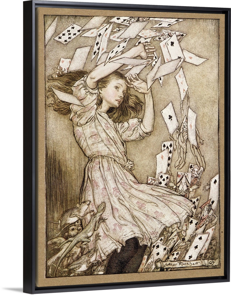 <p>At this the whole pack rose up into the air, and came flying down upon her, from Alice's Adventures in Wonderland, by Lewis Carroll, pub. 1907 (colour litho)</p>