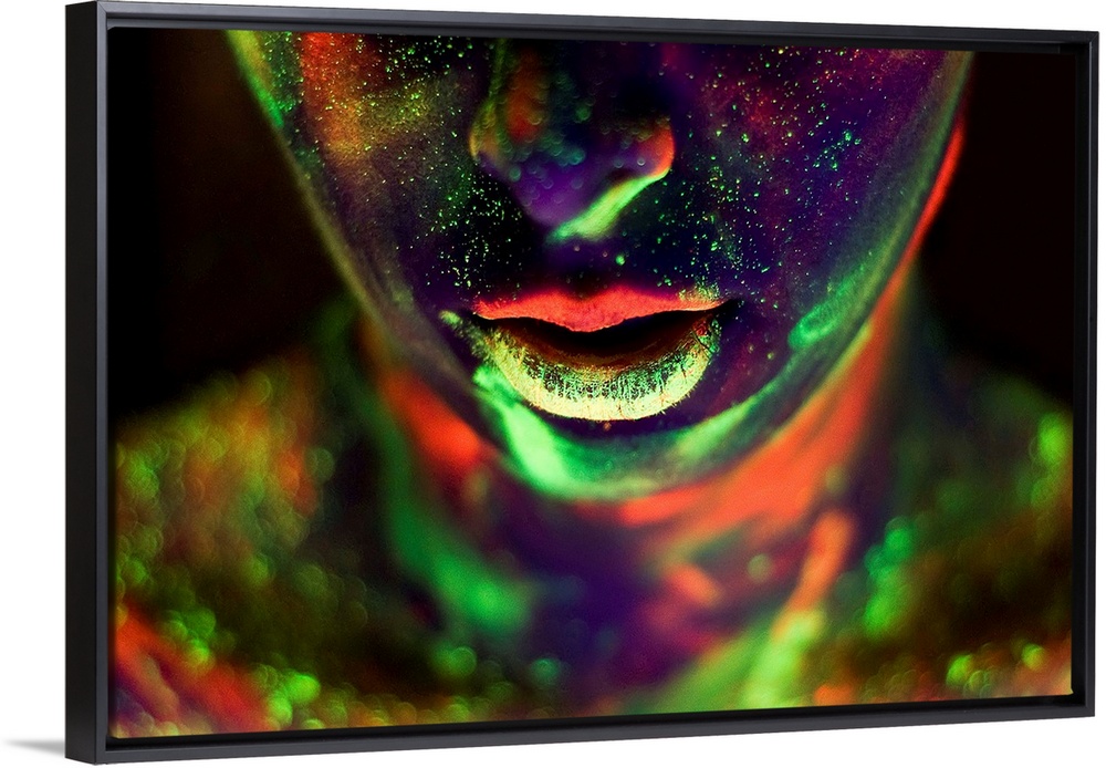 <p>A woman's face and neck covered in glow-in-the-dark paint in neon colors.</p>
