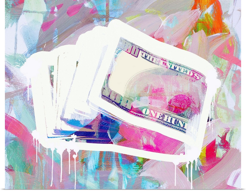 <p>Graffiti art with a stack of one hundred dollar bills on a colorful abstract background created with brushstrokes in all directions.</p>
