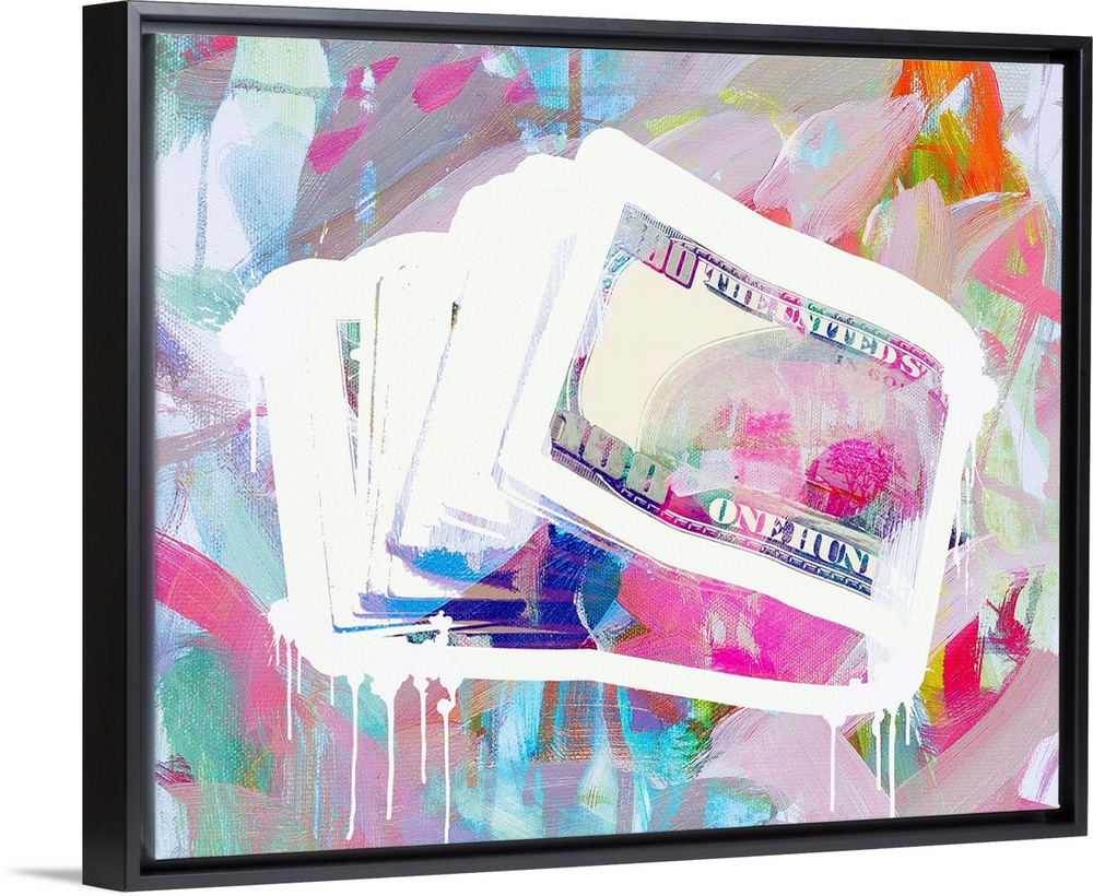<p>Graffiti art with a stack of one hundred dollar bills on a colorful abstract background created with brushstrokes in all directions.</p>