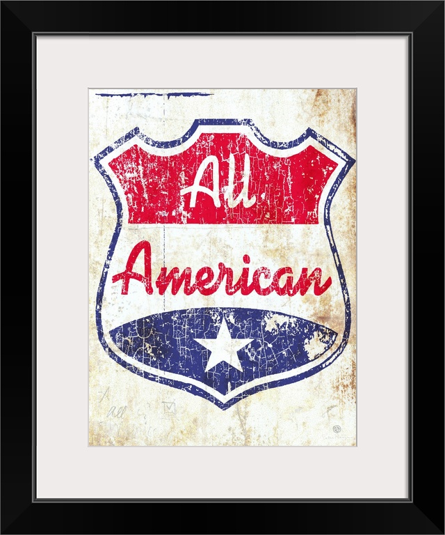 <p>A red, white and blue crest or shield with the words All American on an old aged, distressed, and rusty background.</p>
