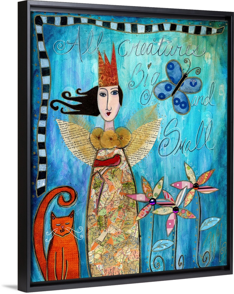 <p>A woman with wings and a crown with an orange cat and a blue butterfly.</p>
