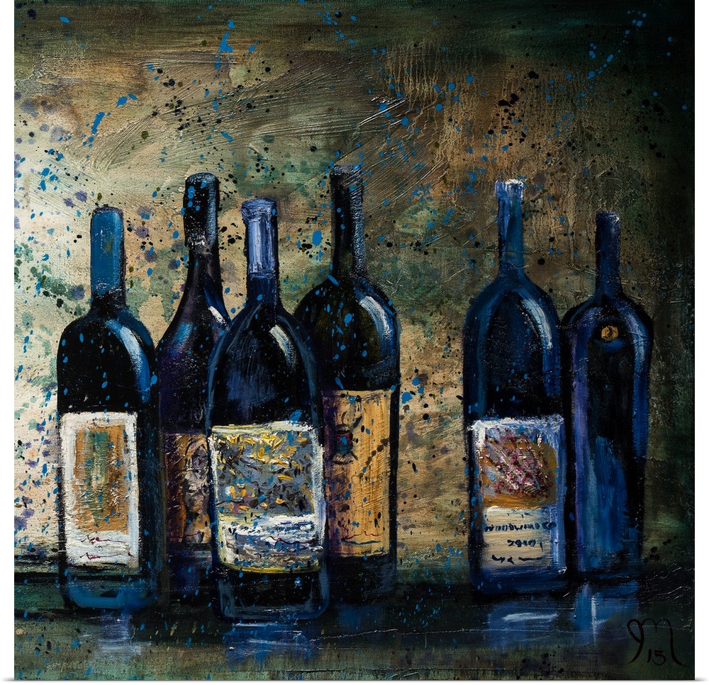 <p>Square painting of cool toned wine bottles with a blue paint splattered overlay.</p>