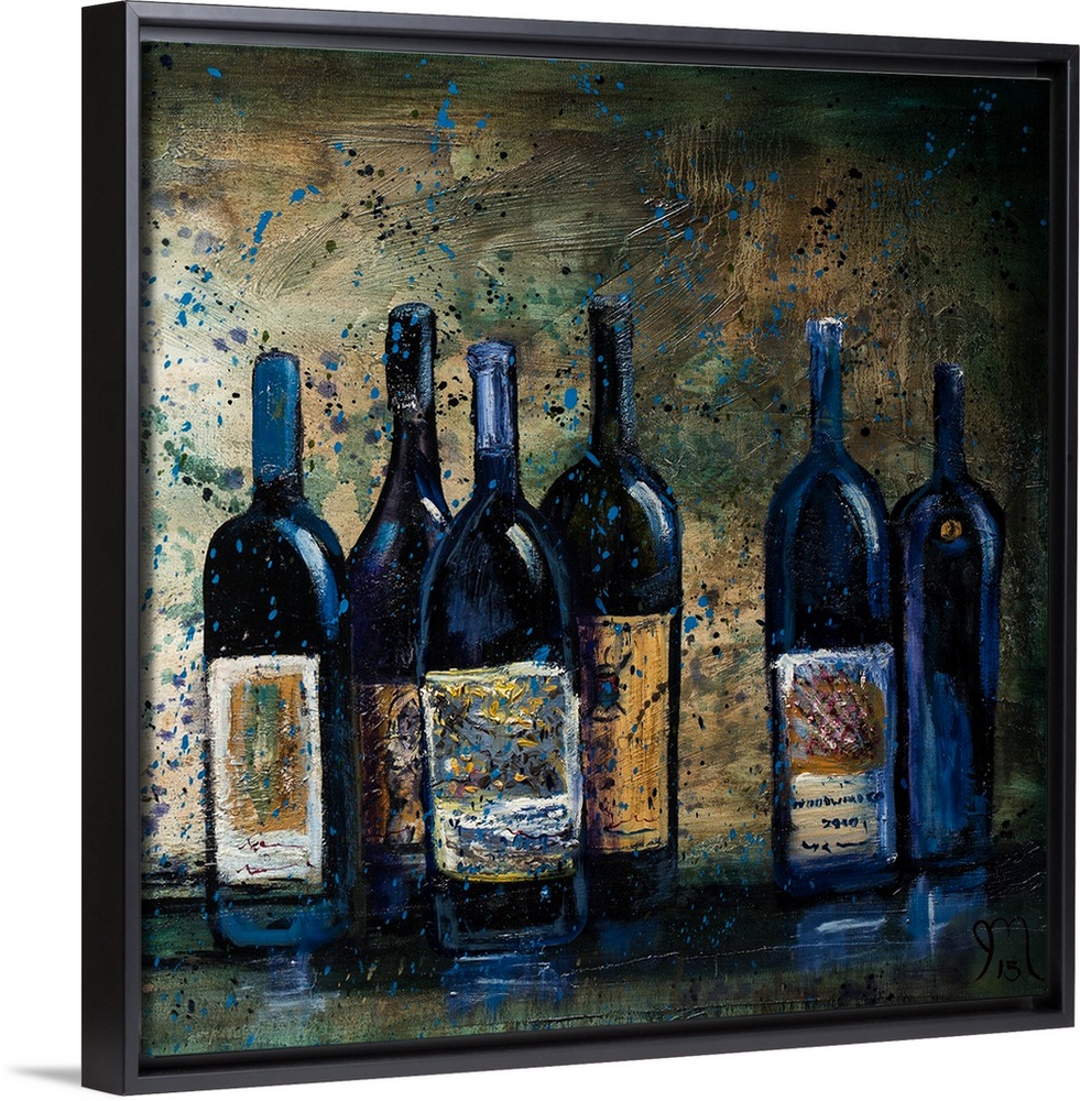<p>Square painting of cool toned wine bottles with a blue paint splattered overlay.</p>