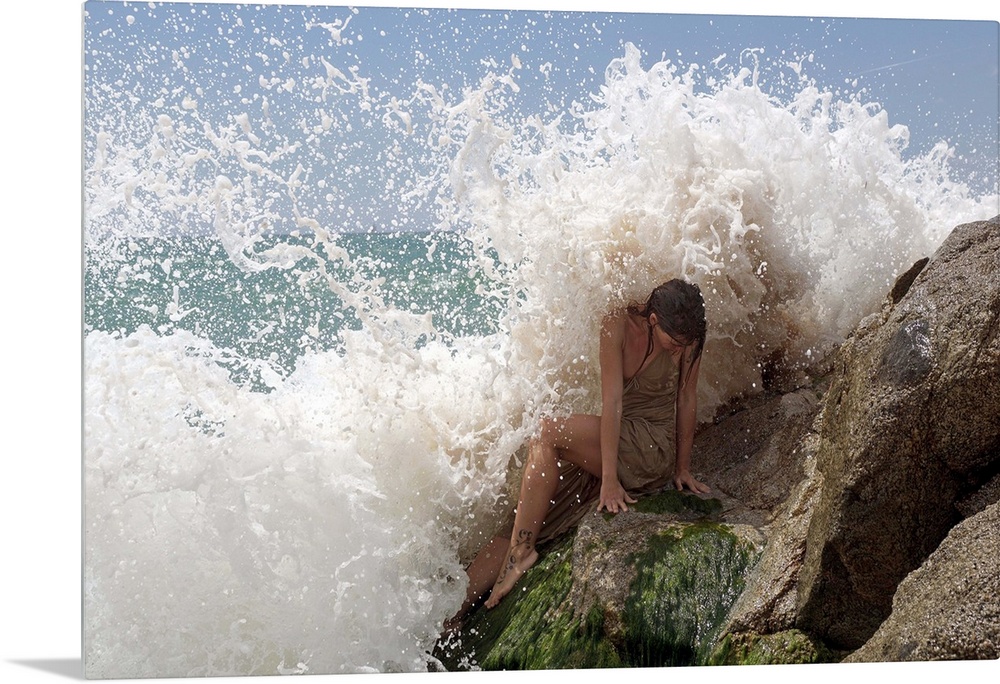 <p>A model on ocean rocks braces herself against the crashing waves.</p>