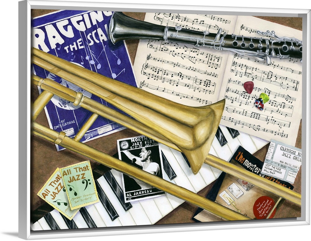 <p>Contemporary colorful still-life painting of instruments and jazz sheet music.</p>