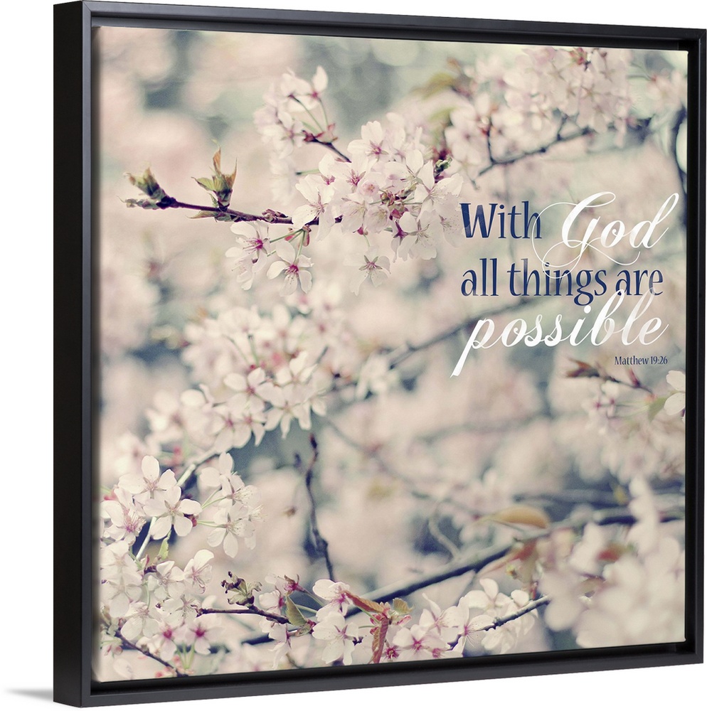 <p>Square photograph of floral tree branches with white and pink flowers and the Bible verse "With God All Things Are Possible" Matthew 19:26</p>