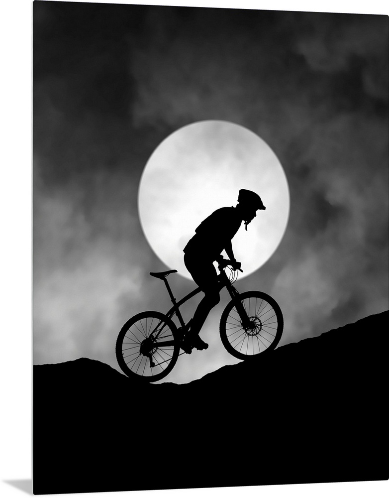 <p>Silhouette of a biker pedaling up a hill, with the moon low in the sky.</p>