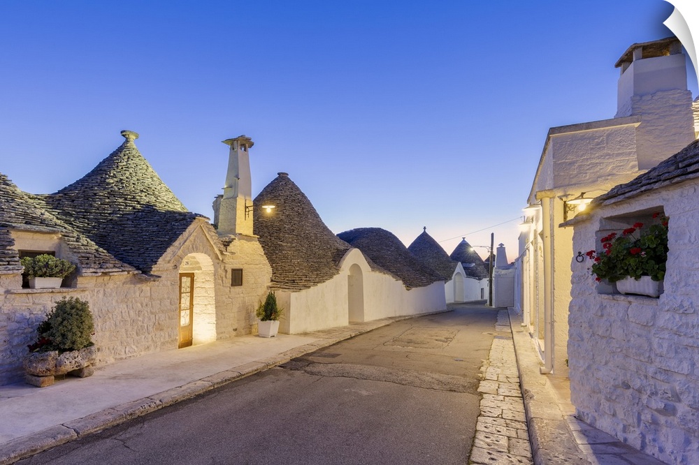 <p>Alley between white trulli houses at dusk. Unesco World Heritage Site, Alberobello, Province of Bari, Apulia, Italy</p>
