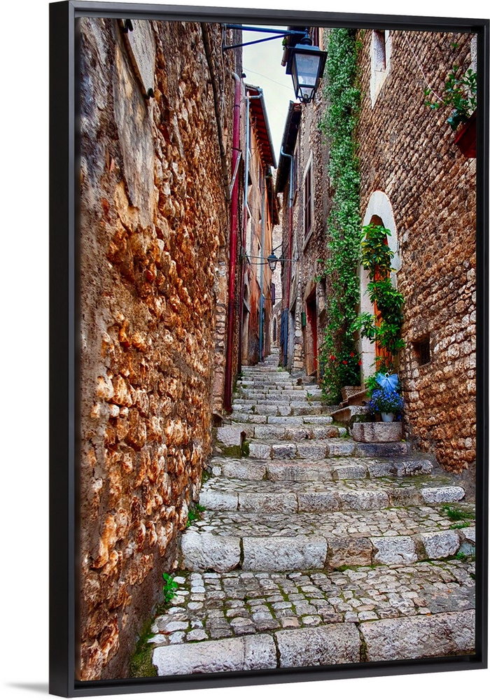 <p>Narrow cobblestone alley in a Medieval town with a Cheese Shop, Sermoneta, Latina, Italy.</p>